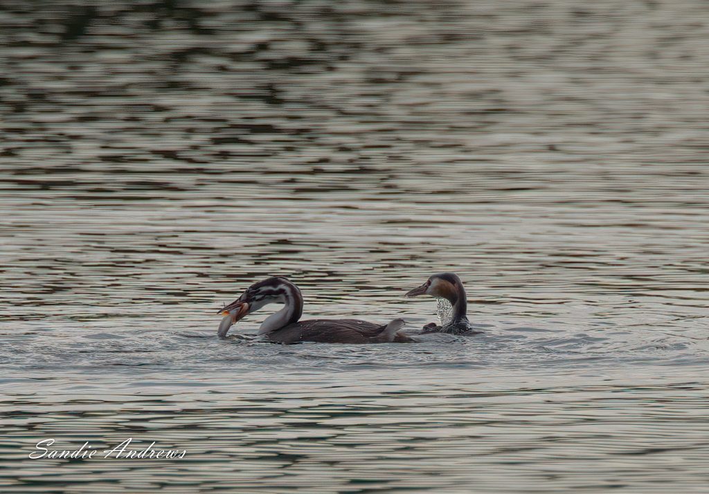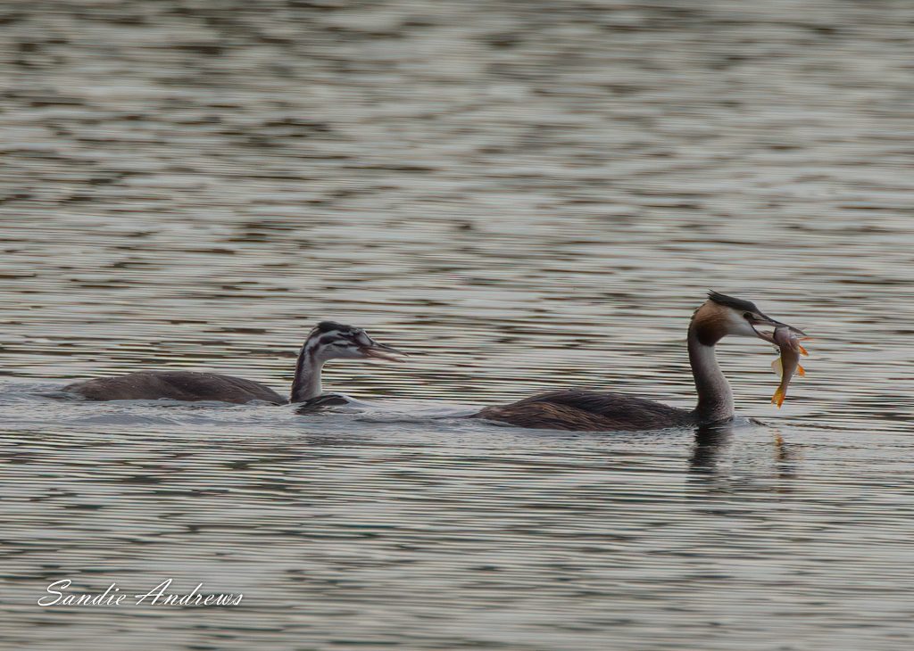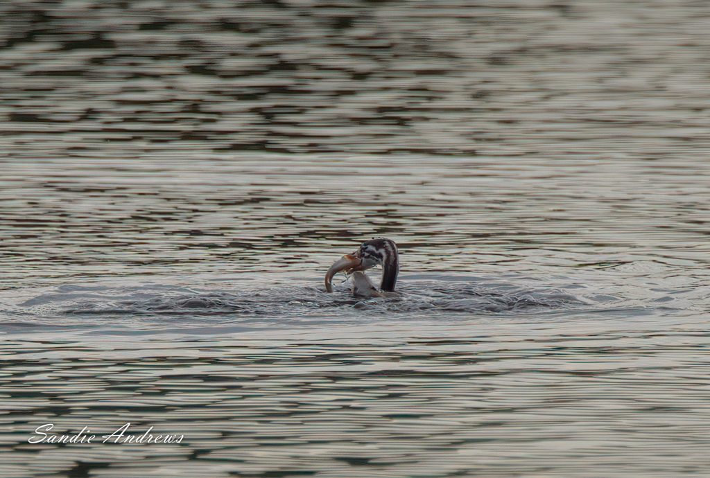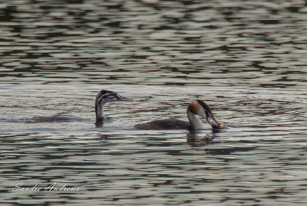 Once the chick has mastered this, the next stage is shown in the next four images. A parent holds a fish in its beak and shows it to the chick. The parent won’t give it to the chick, the chick has to “catch” it. The parent turns away from the chick and races away, the chick follows at similar speed. The parent dives. The chick dives. The ripples disperse and the water is calm – for a few seconds. Then the chick surfaces with the fish in its beak and the parent follows to check that the chick has successfully surfaced with its “catch”.