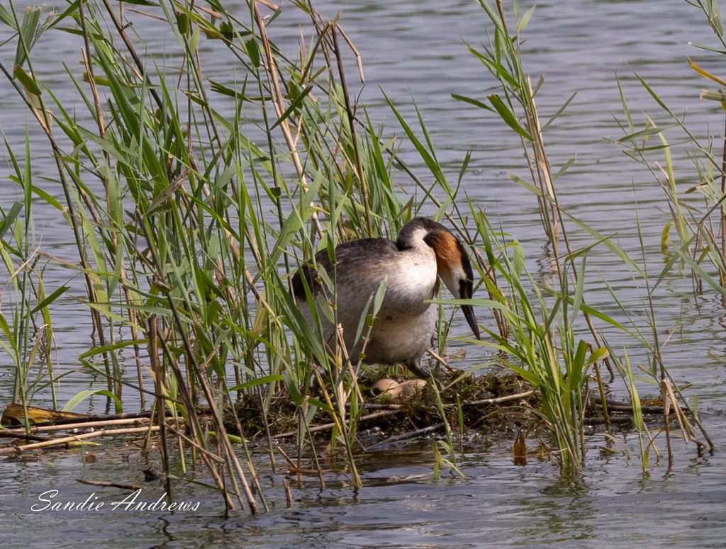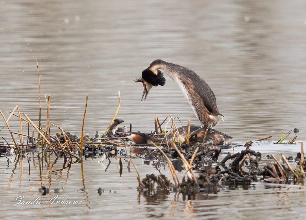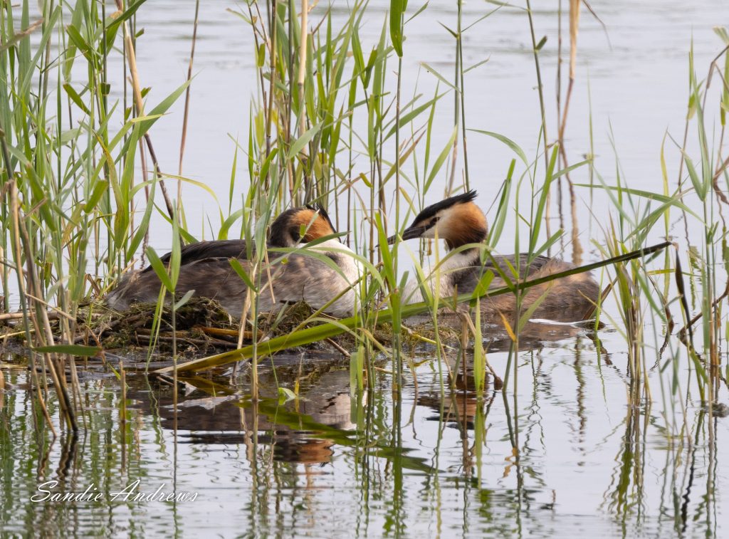 The following images show a little of the upbringing of chicks in a typical great crested grebe family, this sequence starting with parents tending the nest. Never could there be more doting parents.