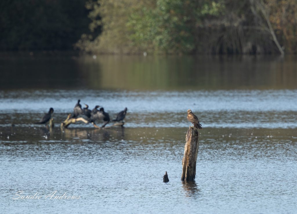 A juvenile Marsh Harrier is hunting over Noah’s Lake on the Somerset Levels. It disturbs some Coot at the south end of the lake and a couple of the juvenile Coots “escape” into the middle of the lake. The Marsh Harrier follows them and lands on a tree stump where it sits for a while whilst things settle down.