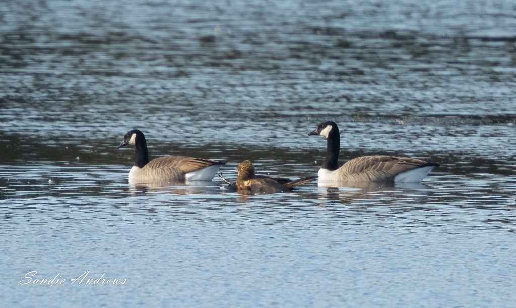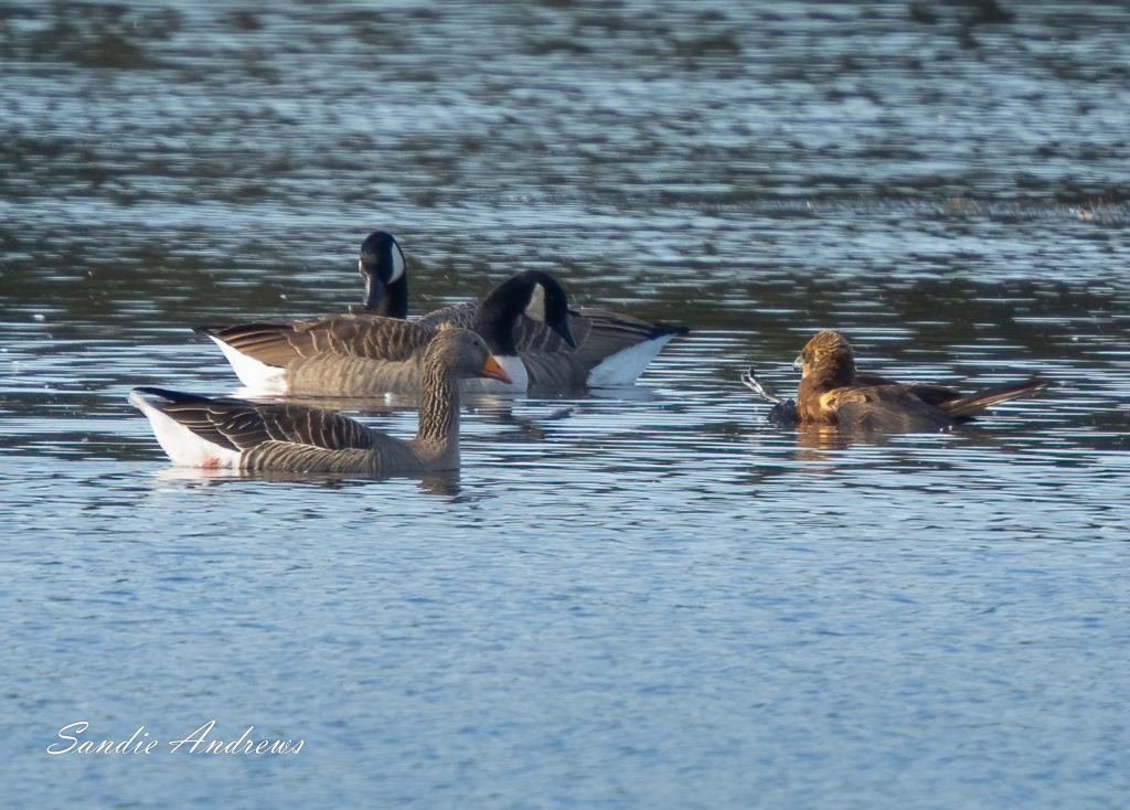 The Marsh Harrier sits mantling its’ catch as first of all two Canada Geese and then a Greylag Goose swim over to see the spectacle. You can see the Coot’s leg sticking out of the water.