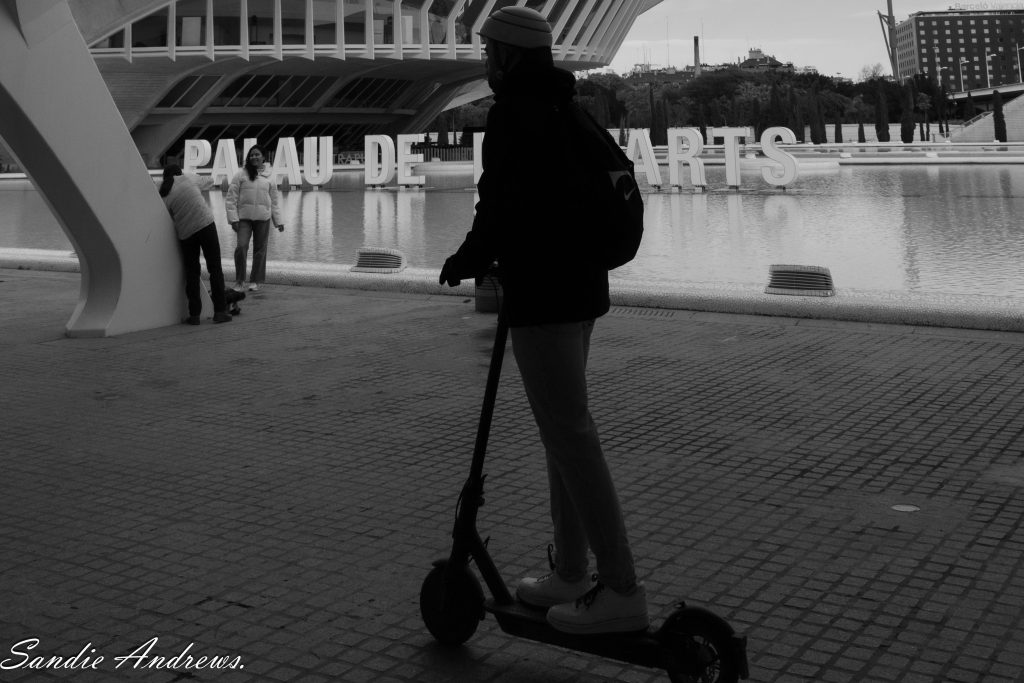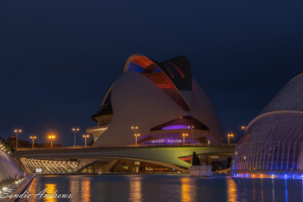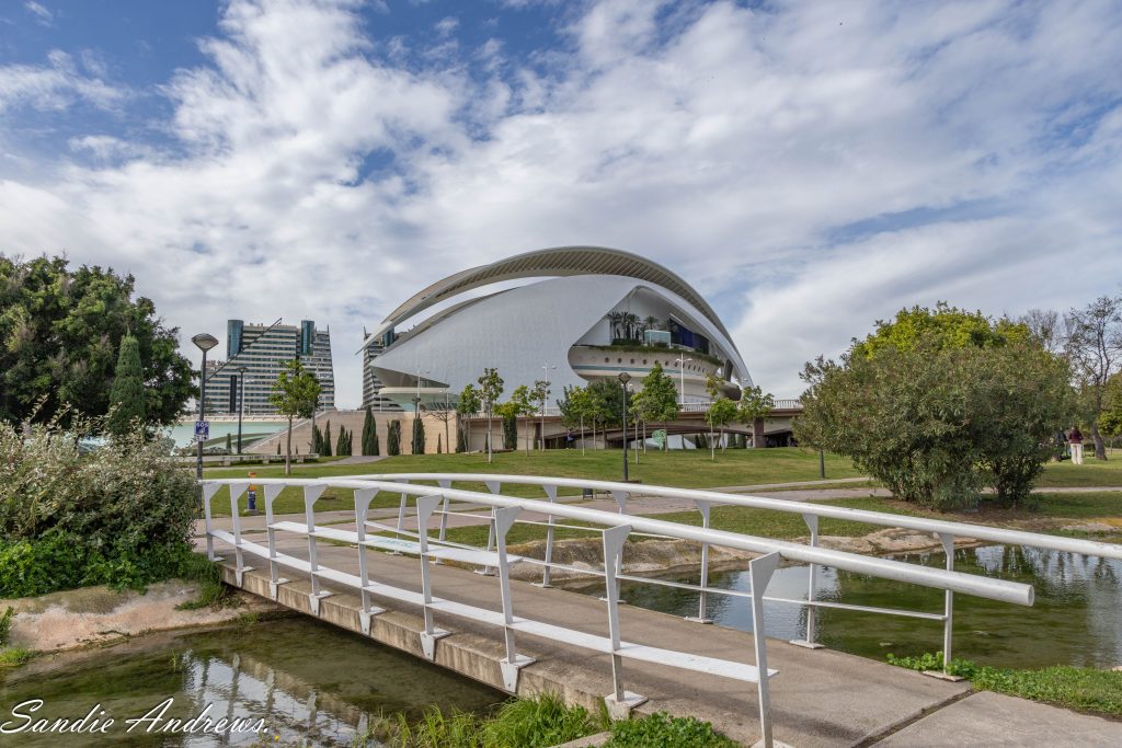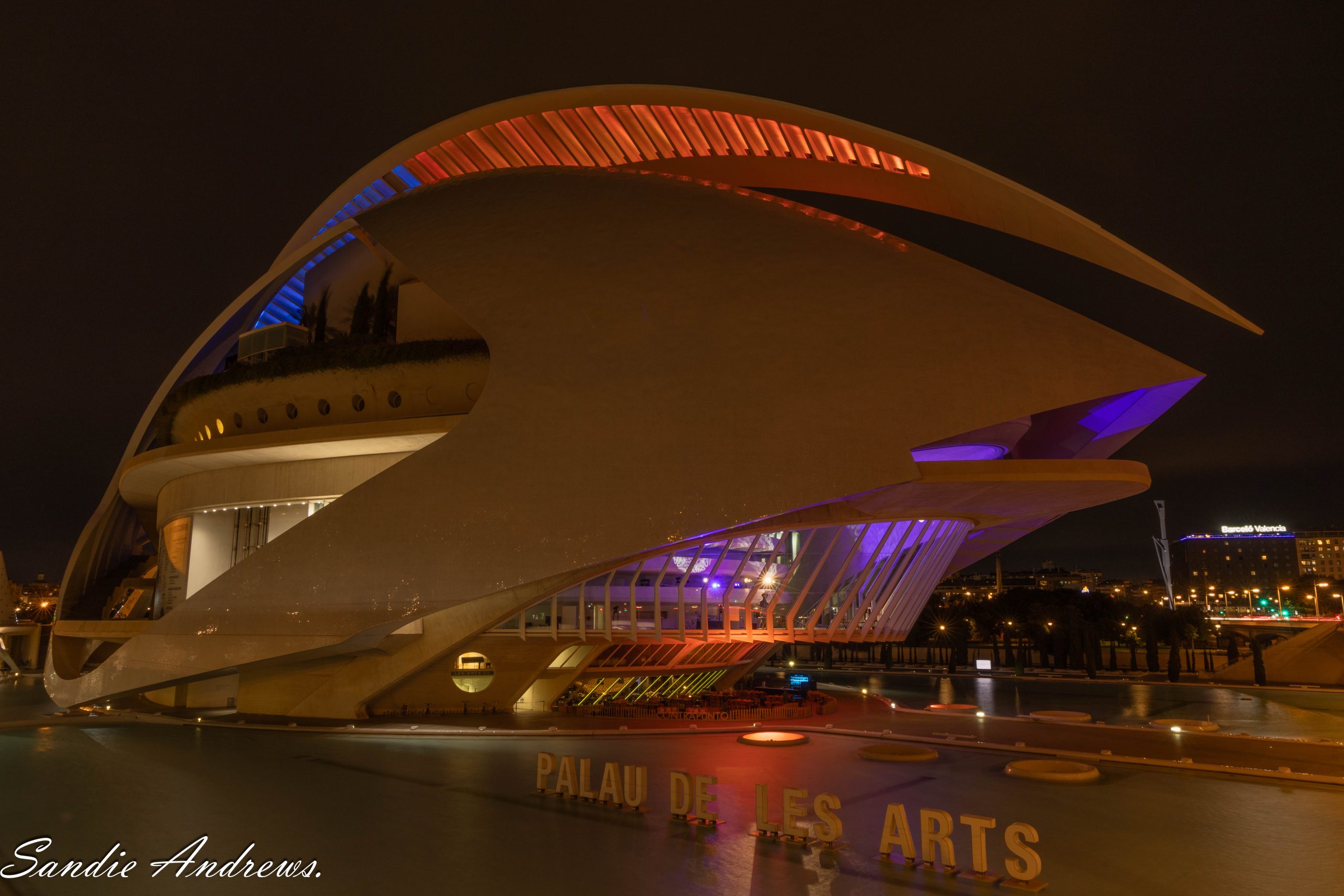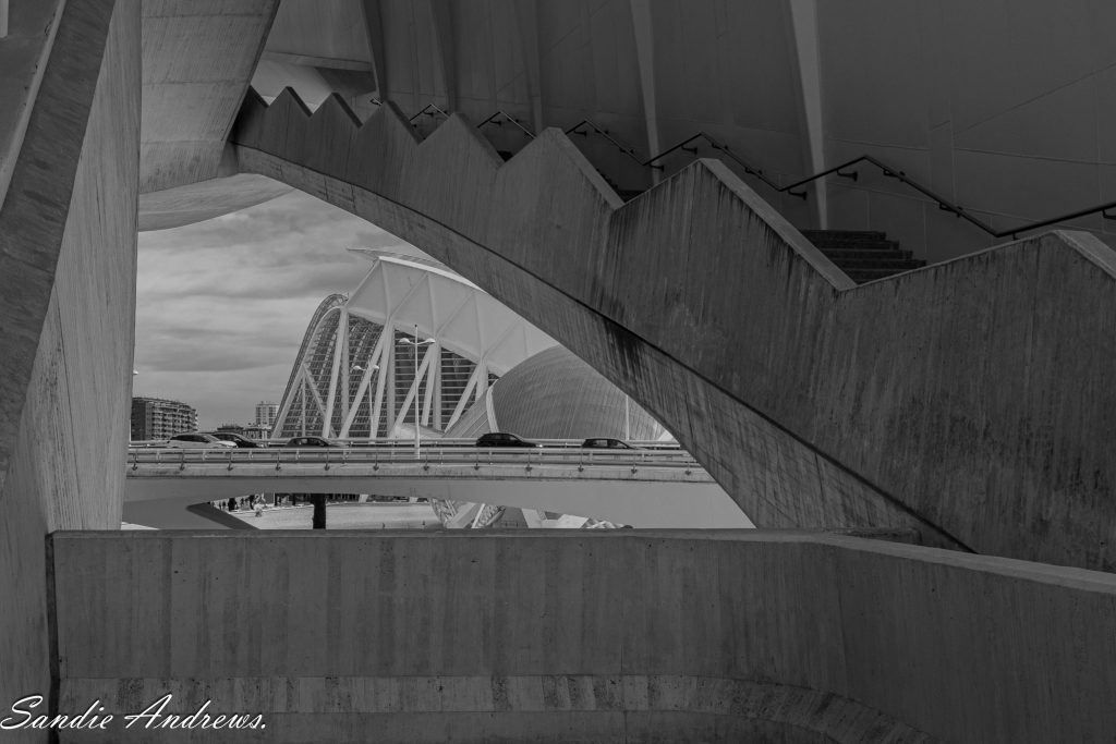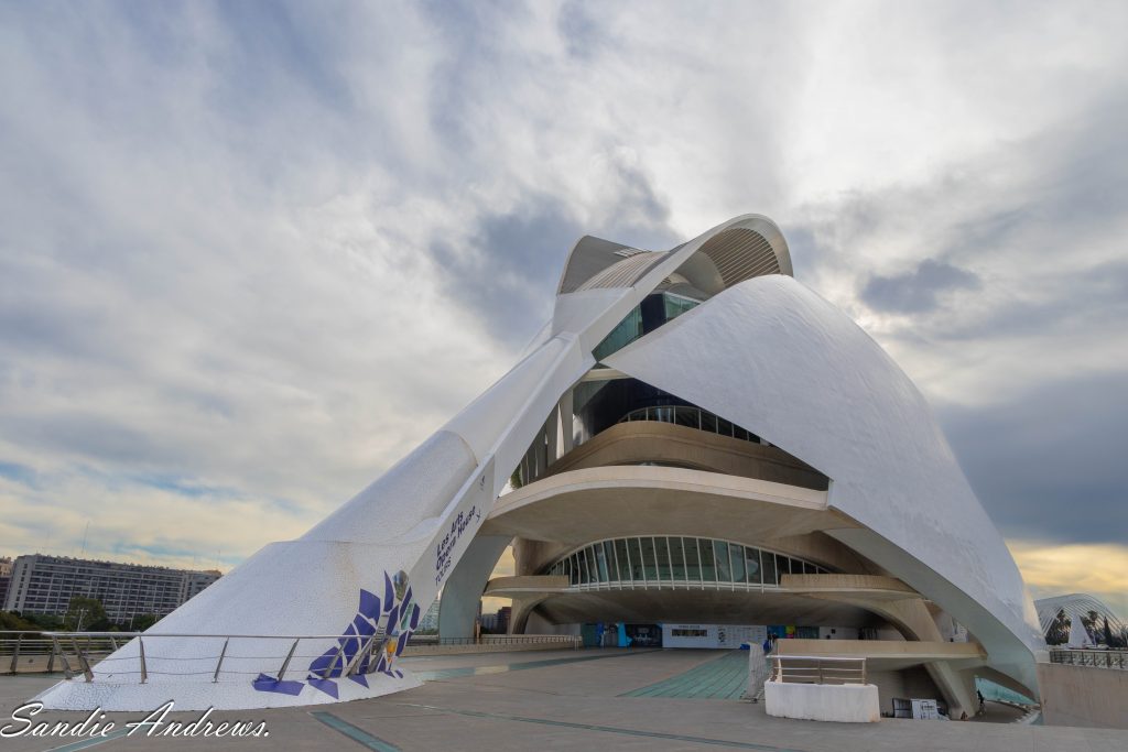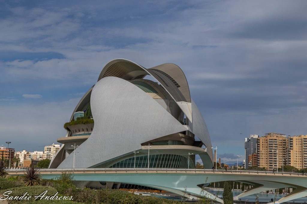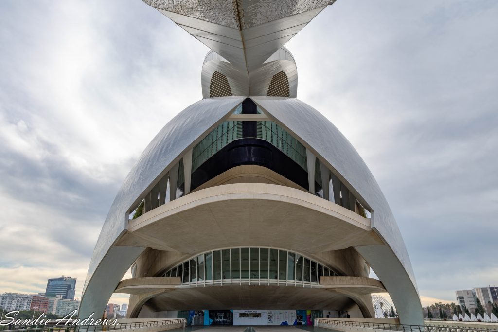 As hard and demanding as wildlife photography is, it is only when you try to portray the beauty of the lines, curves, shapes, colours architected by man do you realise that you have had a relatively easy time of it. As proved to me by the Palau de les Arts and other buildings of the Ciudad de las Artes y las Cienciasas. The architect of this ciudad is Santiago Calatrava and the building was completed in 2005. It is said that this building depicts the helmet of a spartan, above which a massive 230 meter long, 70 meter high curved structural steel roof, or feather, acts as a canopy. The first image shows the feather rising and curving over the building. It is only connected to the ground in two places, this is one, the other is somewhere around its highest point.