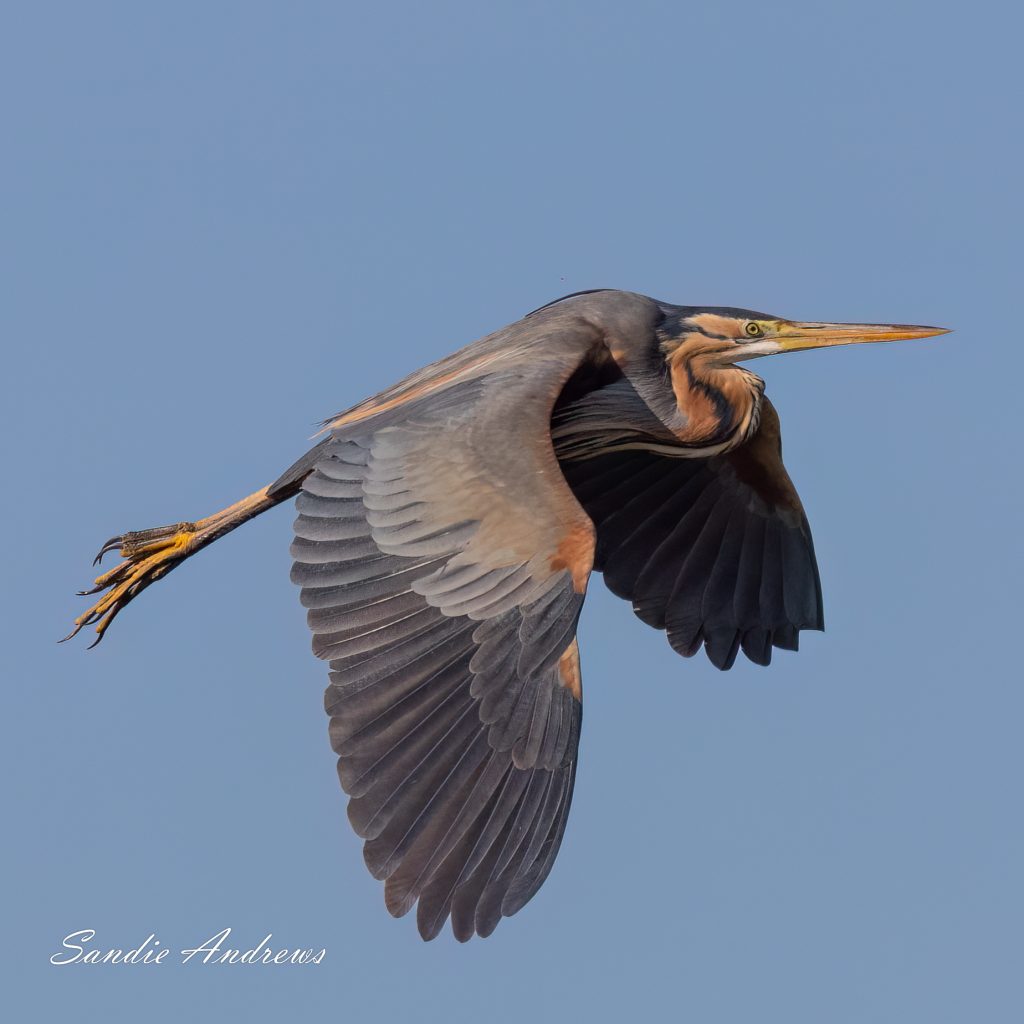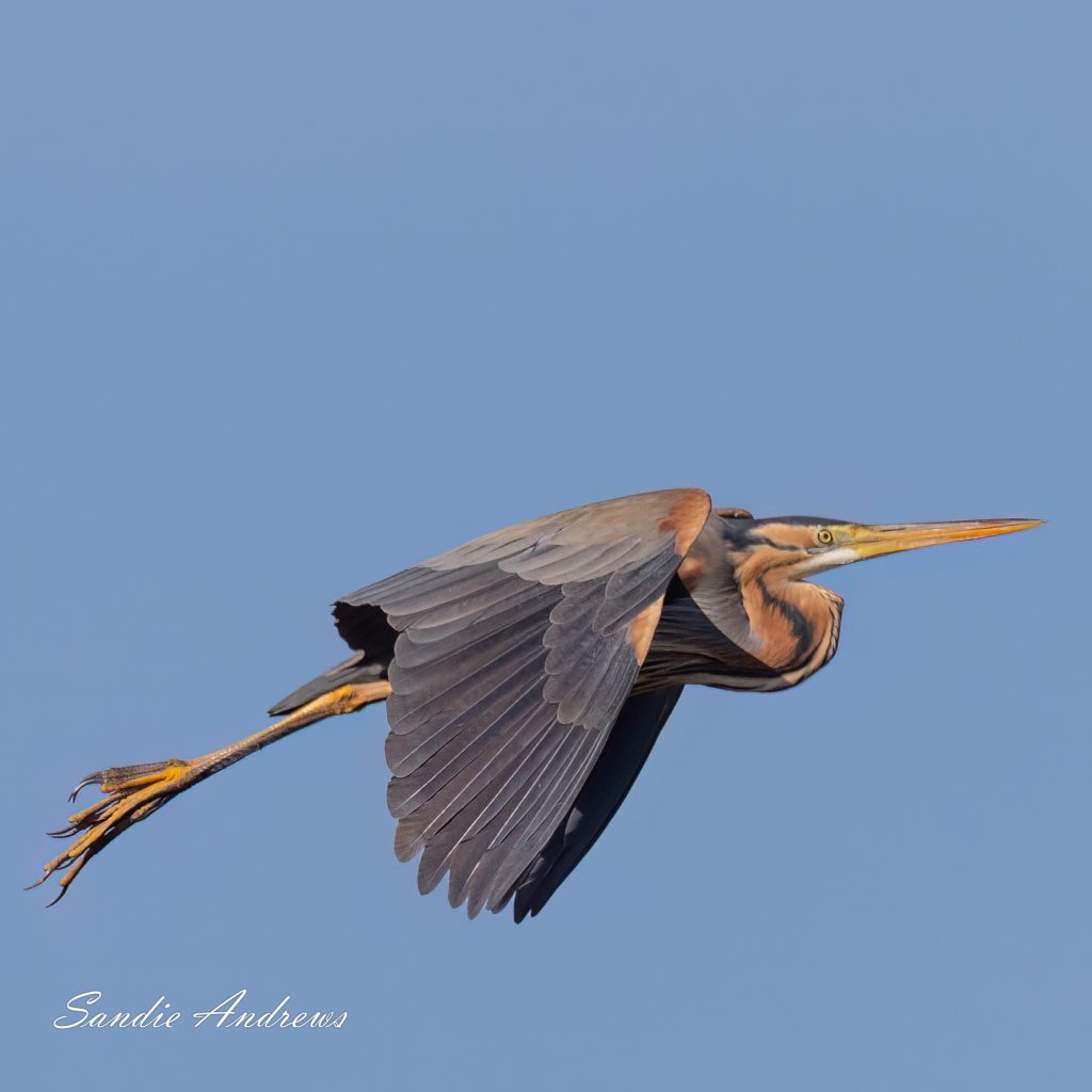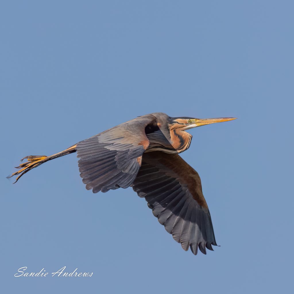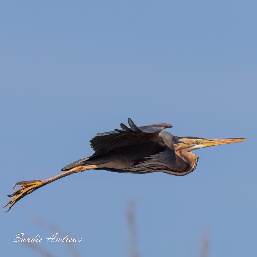 Sometimes expectations are exceeded. A couple of days later we visited the Scamandra reserve. We had been there all day and with just 20 minutes left before it closed we were about to pack our gear away. We had had a fabulous day and were delighted with the many stunning birds, lizards, frogs, bulls and much more that we saw. The late afternoon light was perfect, the sun was behind us, no one else was there. I looked left to take a final panoramic sweep of the vista and saw a Purple Heron flying straight towards us. This was the dream photographic opportunity. So I hope you can enjoy the images and be as thrilled as we were.