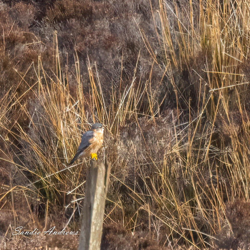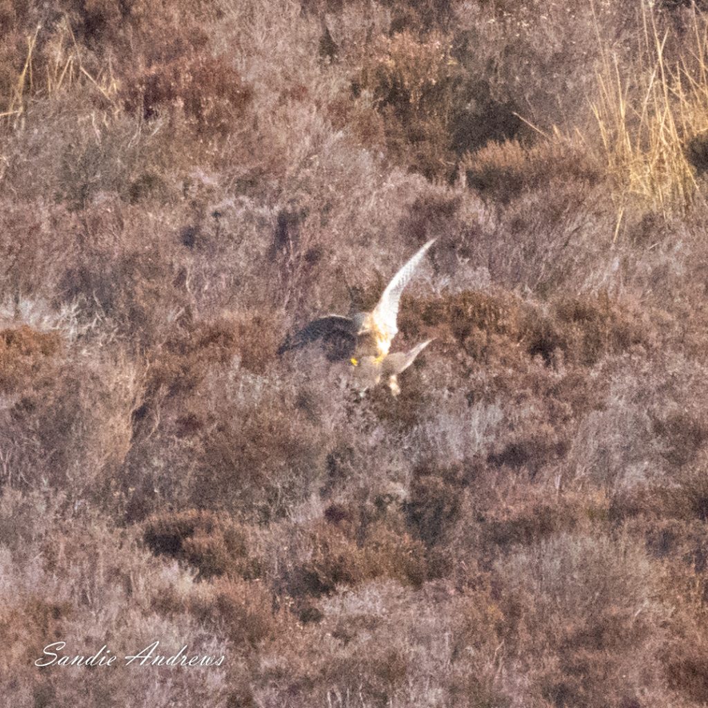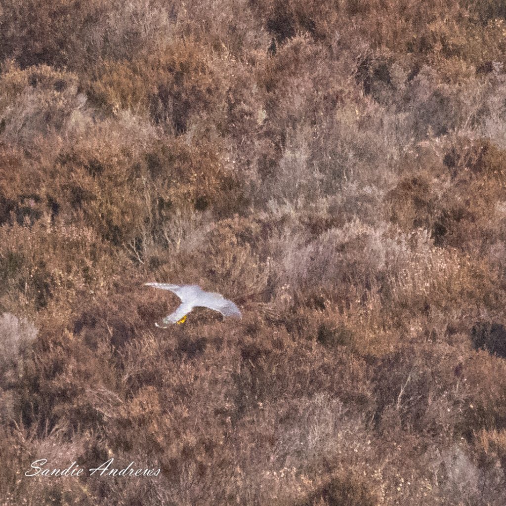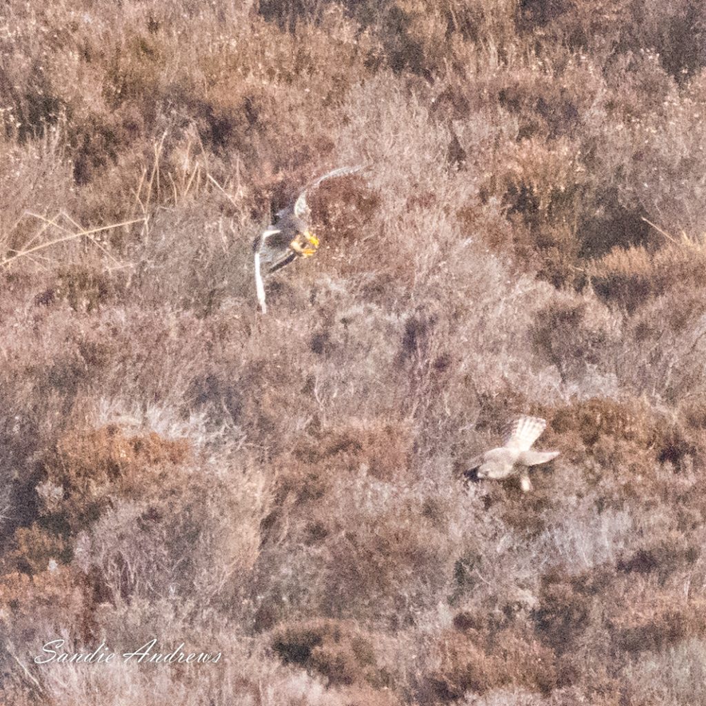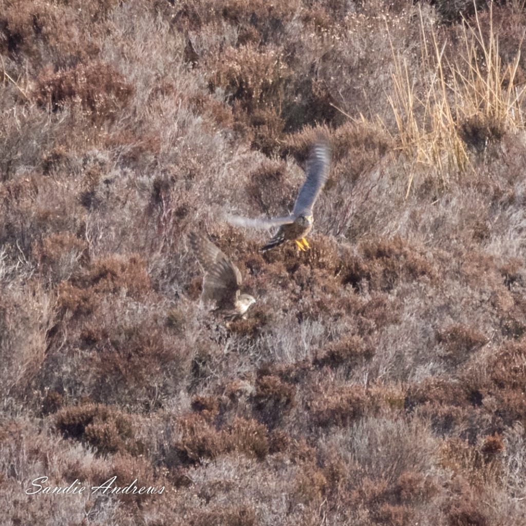 We heard the calling first then saw, perched on a fence post over a hundred metres away, a male Merlin. The female was on another fence post some way from him. How very small they are. She flew off but they continued to call to each other and it was several minutes before we saw her again waiting on some heather. The male took off and flew low over the heather, slowly meandering his way towards her. There she was, wings outstretched and tail fully displayed. He was above her. They mated. How beautiful nature can be.